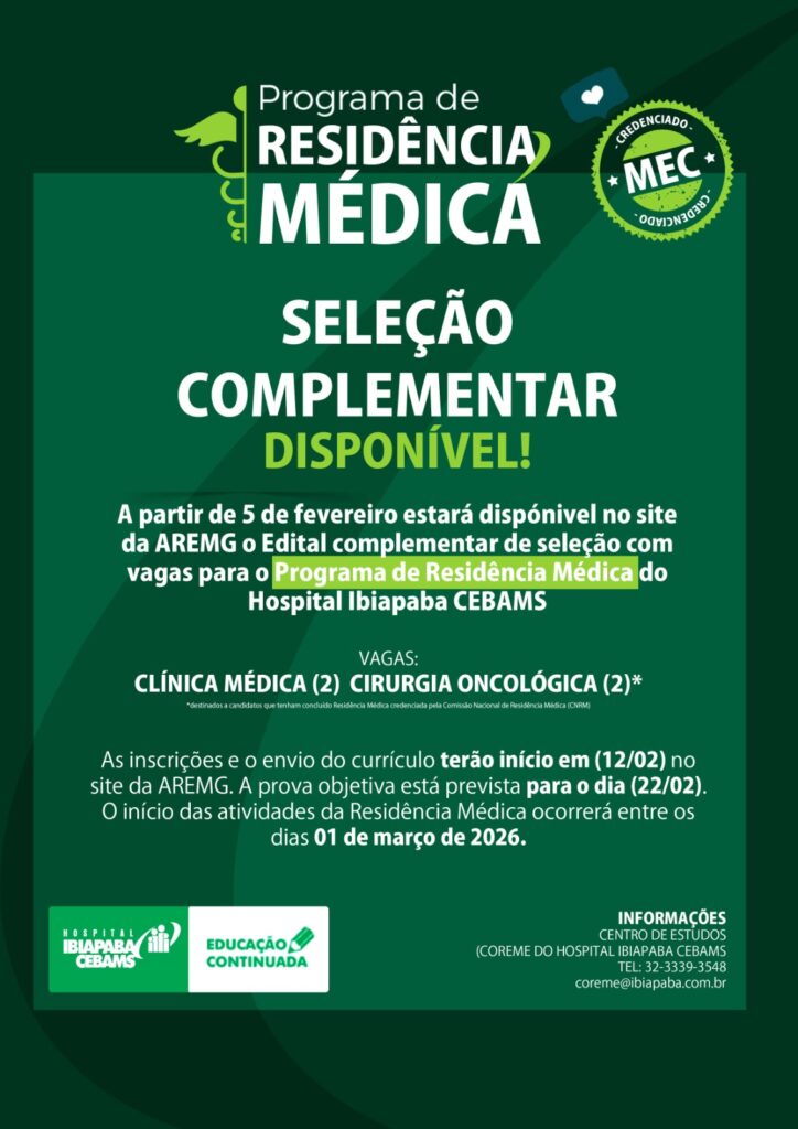 A partir de 5 de fevereiro estará dispónivel no site da AREMG o Edital complementar de seleção com vagas para o Programa de Residência Médica do Hospital Ibiapaba CEBAMS, em Barbacena. Nesta edição, são oferecidas vagas para as especialidades de Clínica Médica e Cirurgia Oncológica.